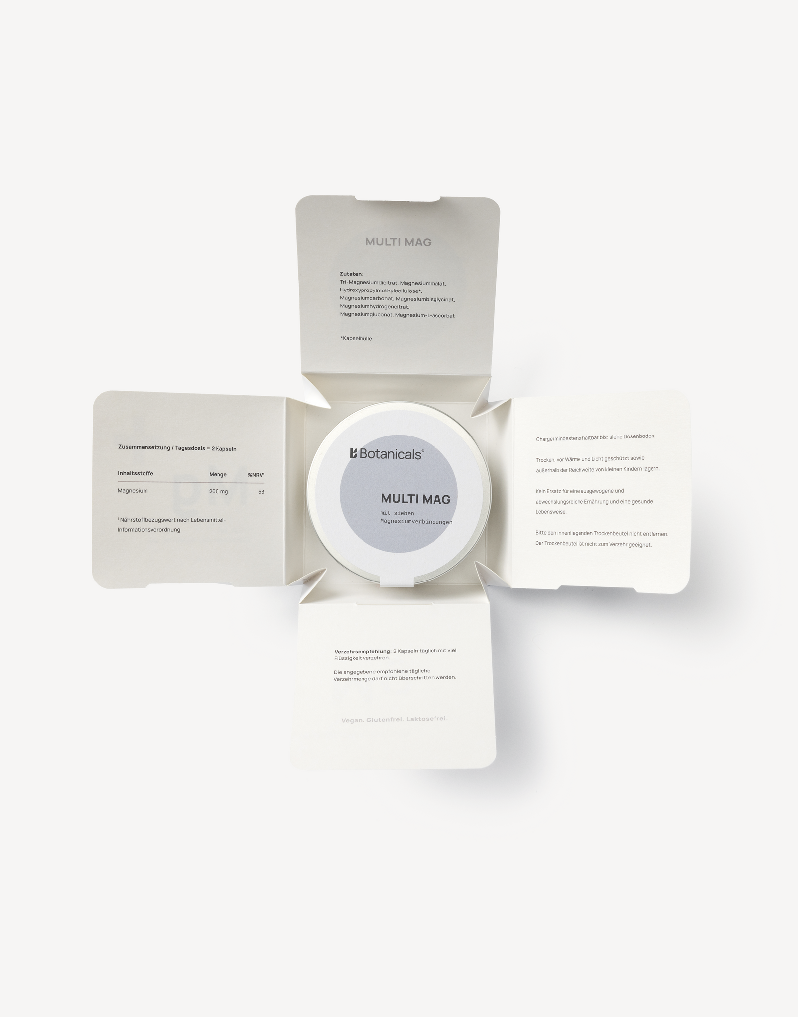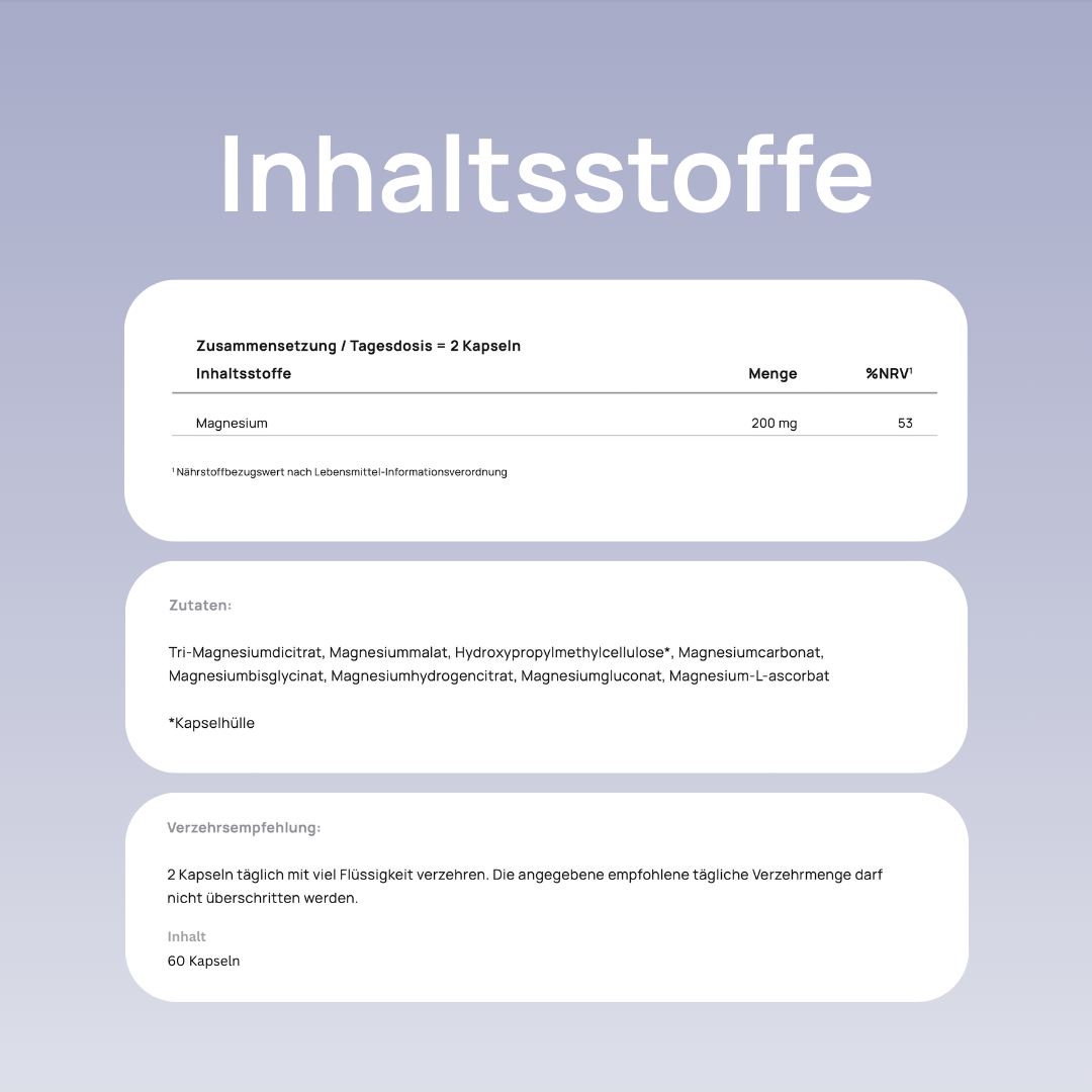 Multi Mag ist glutenfrei, laktosefrei und vegan. Die pflanzliche Kapselhülle macht das Produkt ideal für eine bewusste, moderne Ernährung.